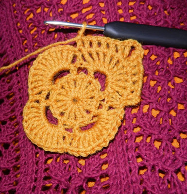 Siirry piilosilmukalla ensimmäisen ja toisen pitkän pylvään väliin.Tee 8 ketjusilmukkaa (3 ekaa korvaa pylvään), 1 pylväs kahden pitkän pylvään päähän väliin, 3 ketjusilmukkaa, 1 pylväs kahden pitkän pylvään päähän väliin, *5kjs, 1 p*, toista *-* yhteensä 3 kertaa. Sulje kerros piilosilmukalla kolmanteen ketjusilmukkaan.